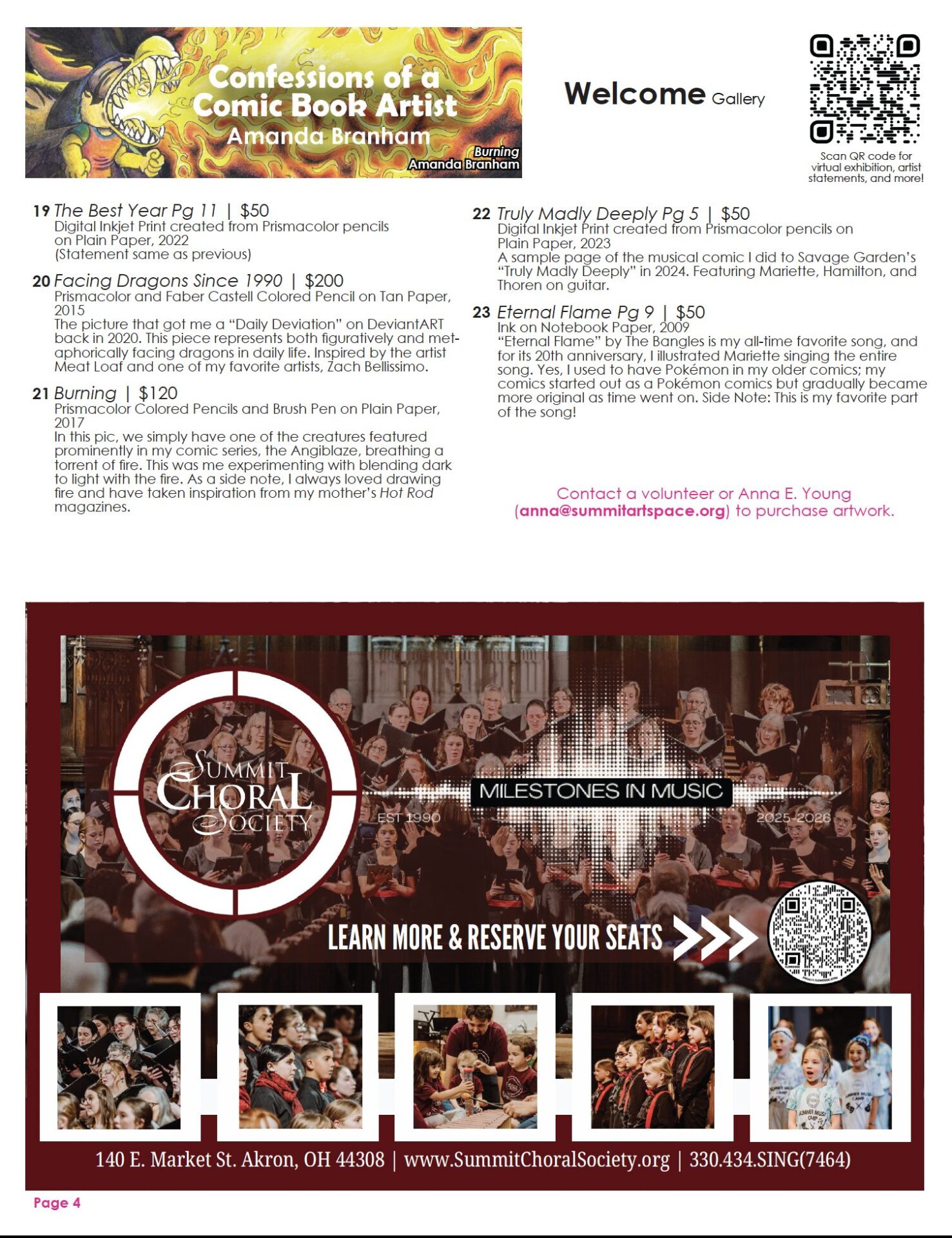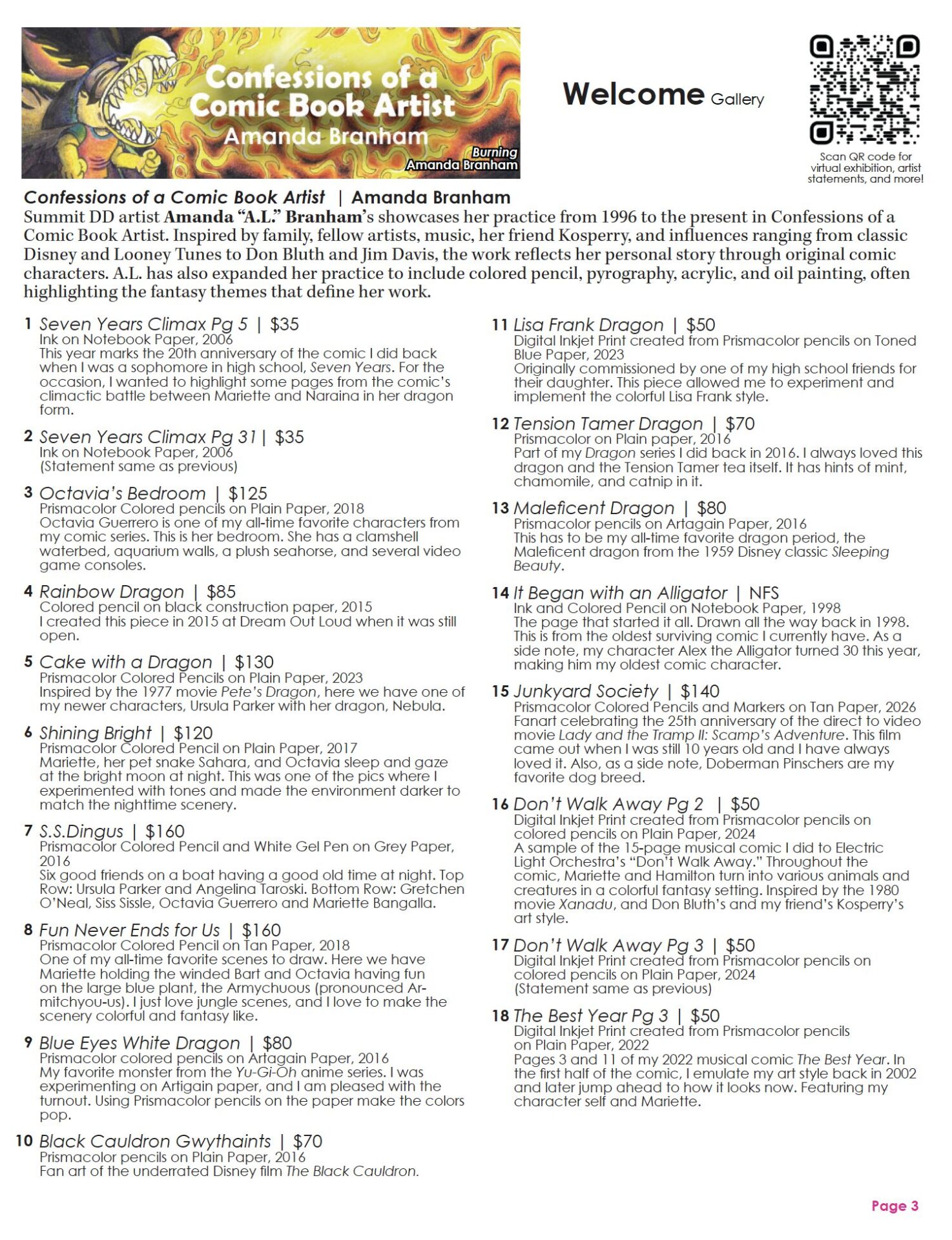 Summit DD artist Amanda “A.L.” Branham’s showcases her practice from 1996 to the present in Confessions of a Comic Book Artist. Inspired by family, fellow artists, music, her friend Kosperry, and influences ranging from classic Disney and Looney Tunes to Don Bluth and Jim Davis, the work reflects her personal story through original comic characters. A.L. has also expanded her practice to include colored pencil, pyrography, acrylic, and oil painting, often highlighting the fantasy themes that define her work.