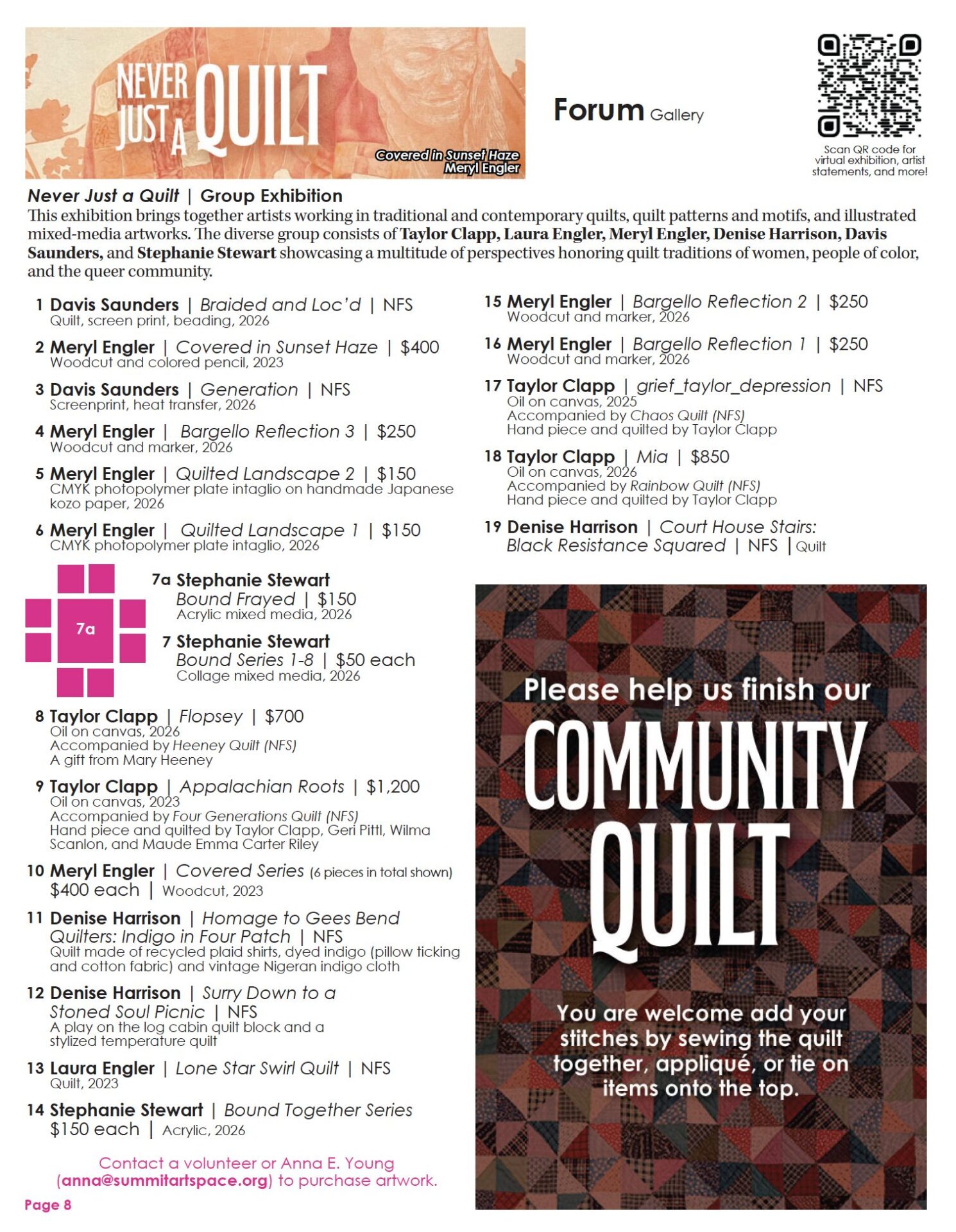This exhibition brings together artists working in traditional and contemporary quilts, quilt patterns and motifs, and illustrated mixed-media artworks. The diverse group consists of Taylor Clapp, Laura Engler, Meryl Engler, Denise Harrison, Davis Saunders, and Stephanie Stewart showcasing a multitude of perspectives honoring quilt traditions of women, people of color, and the queer community.