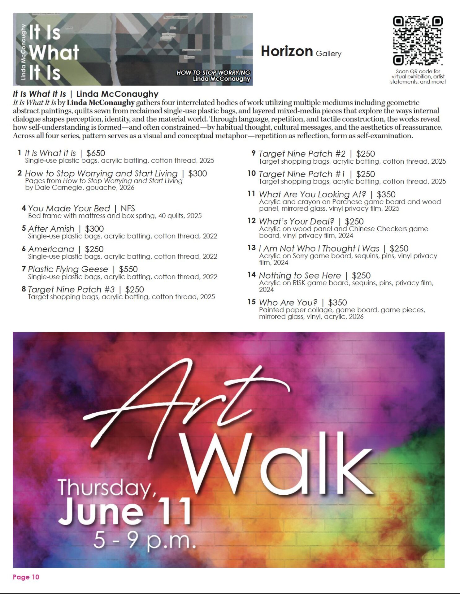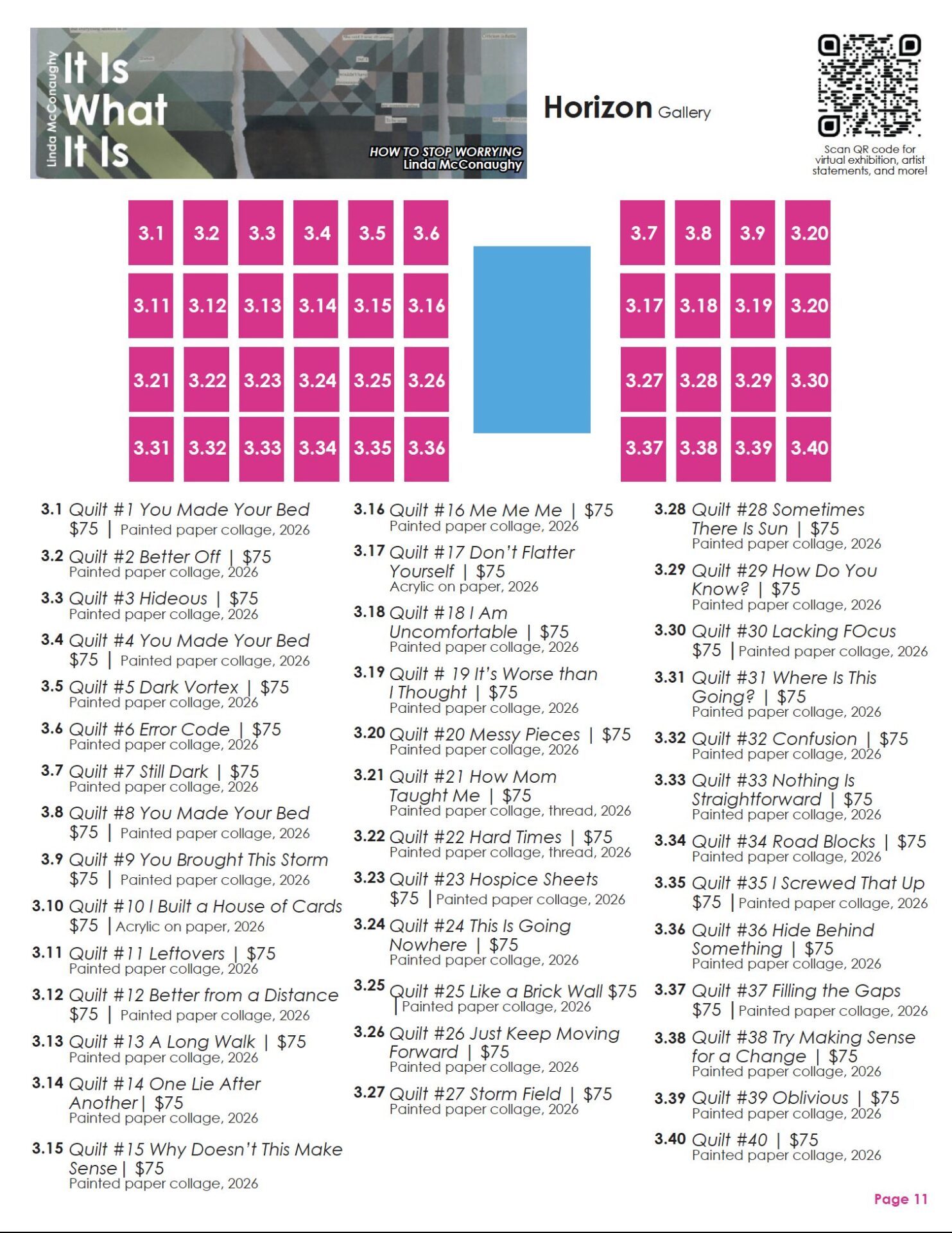 It Is What It Is by Linda McConaughy gathers four interrelated bodies of work utilizing multiple mediums including geometric abstract paintings, quilts sewn from reclaimed single-use plastic bags, and layered mixed-media pieces that explore the ways internal dialogue shapes perception, identity, and the material world. Through language, repetition, and tactile construction, the works reveal how self-understanding is formed—and often constrained—by habitual thought, cultural messages, and the aesthetics of reassurance. Across all four series, pattern serves as a visual and conceptual metaphor—repetition as reflection, form as self-examination.