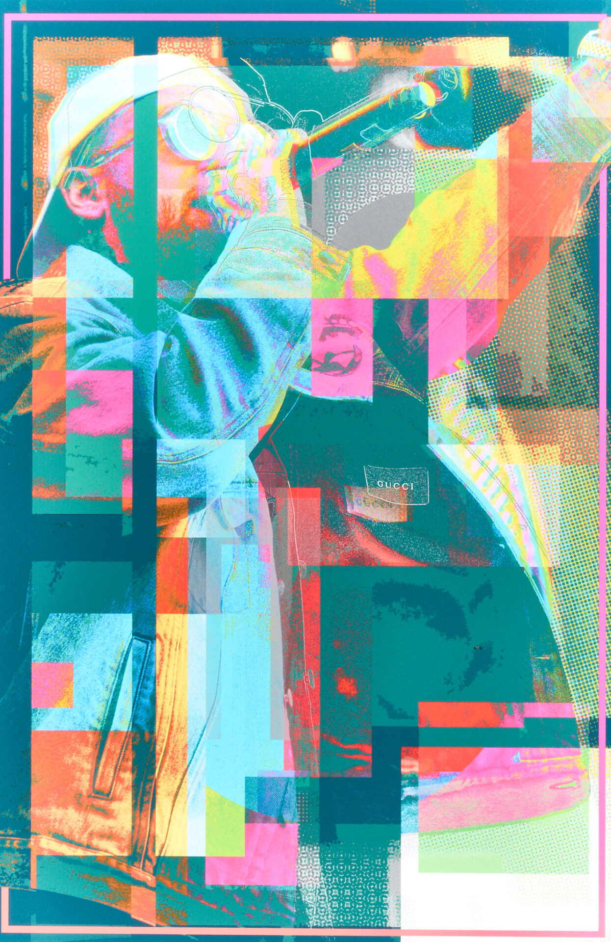 A charcuterie of textures and colors surrounds and envelopes Mac Miller on stage during the last year of his life. The threads of the denim jacket blended against themselves in different color channels along with various size color halftones, and some tracing of hard edges help exemplify the unique energy Mac radiated in his life and through his music.
