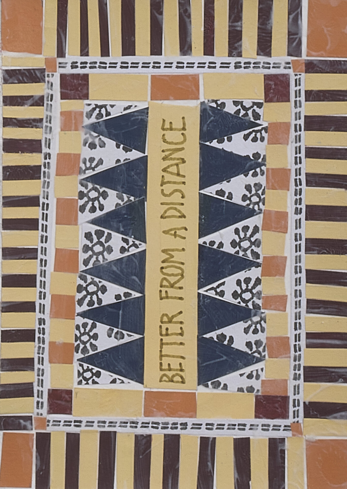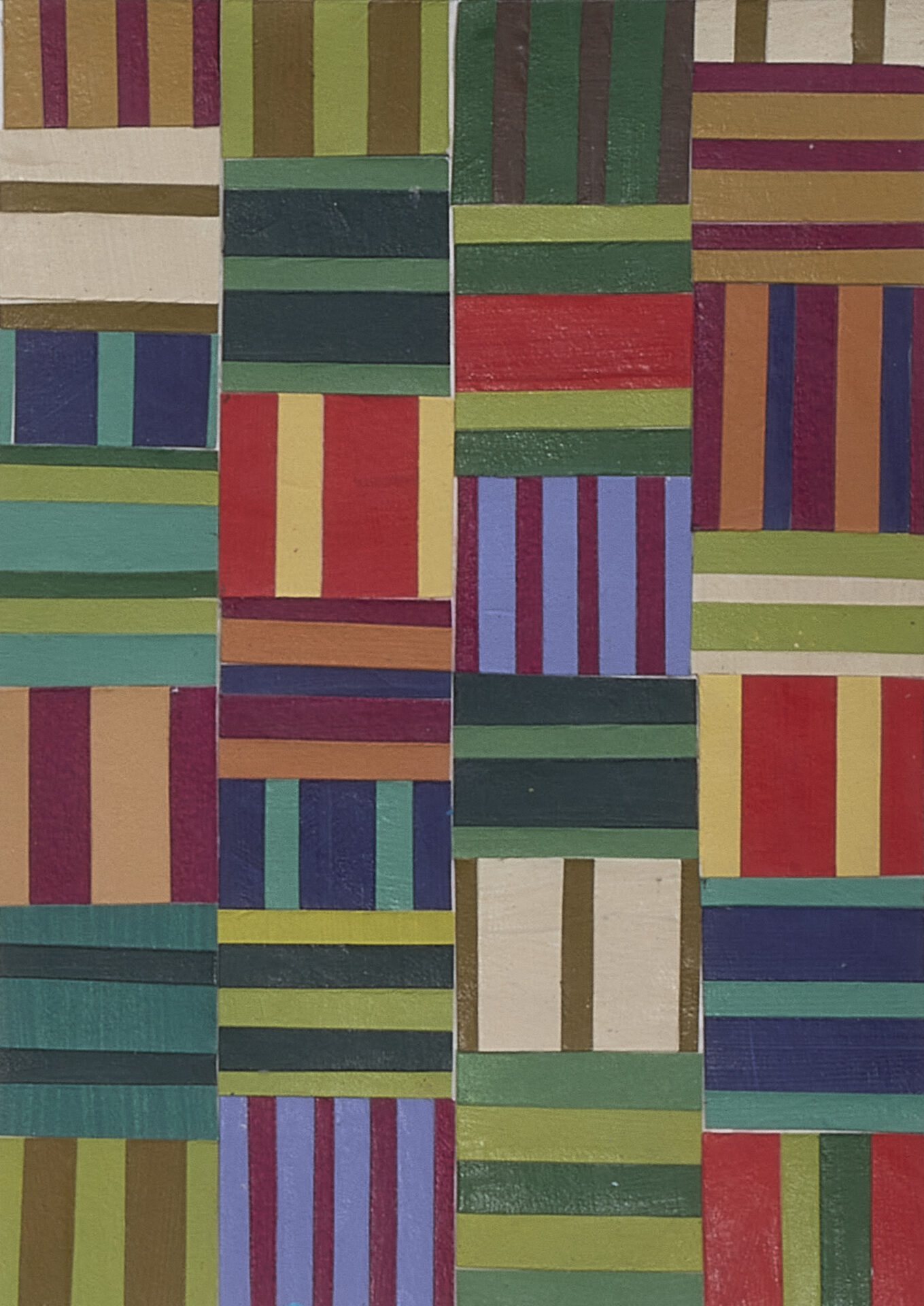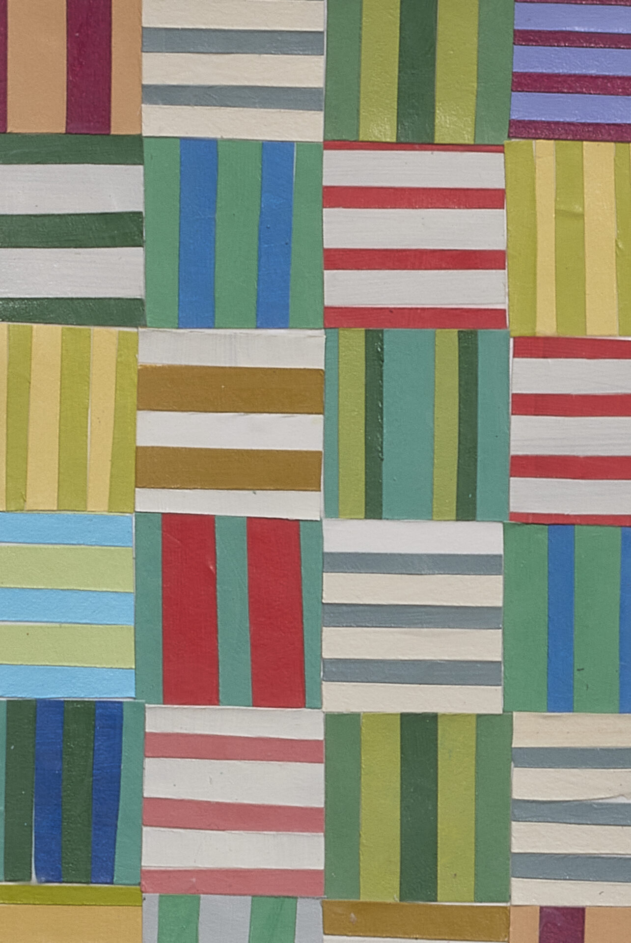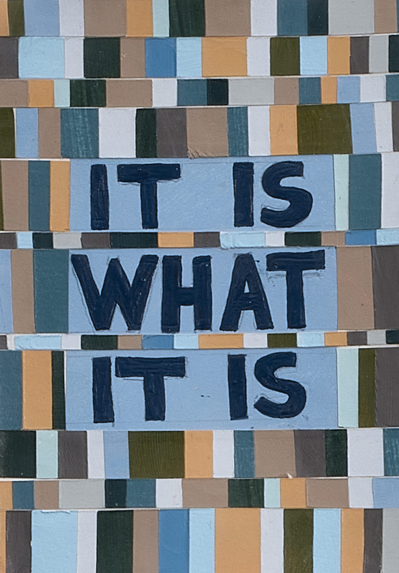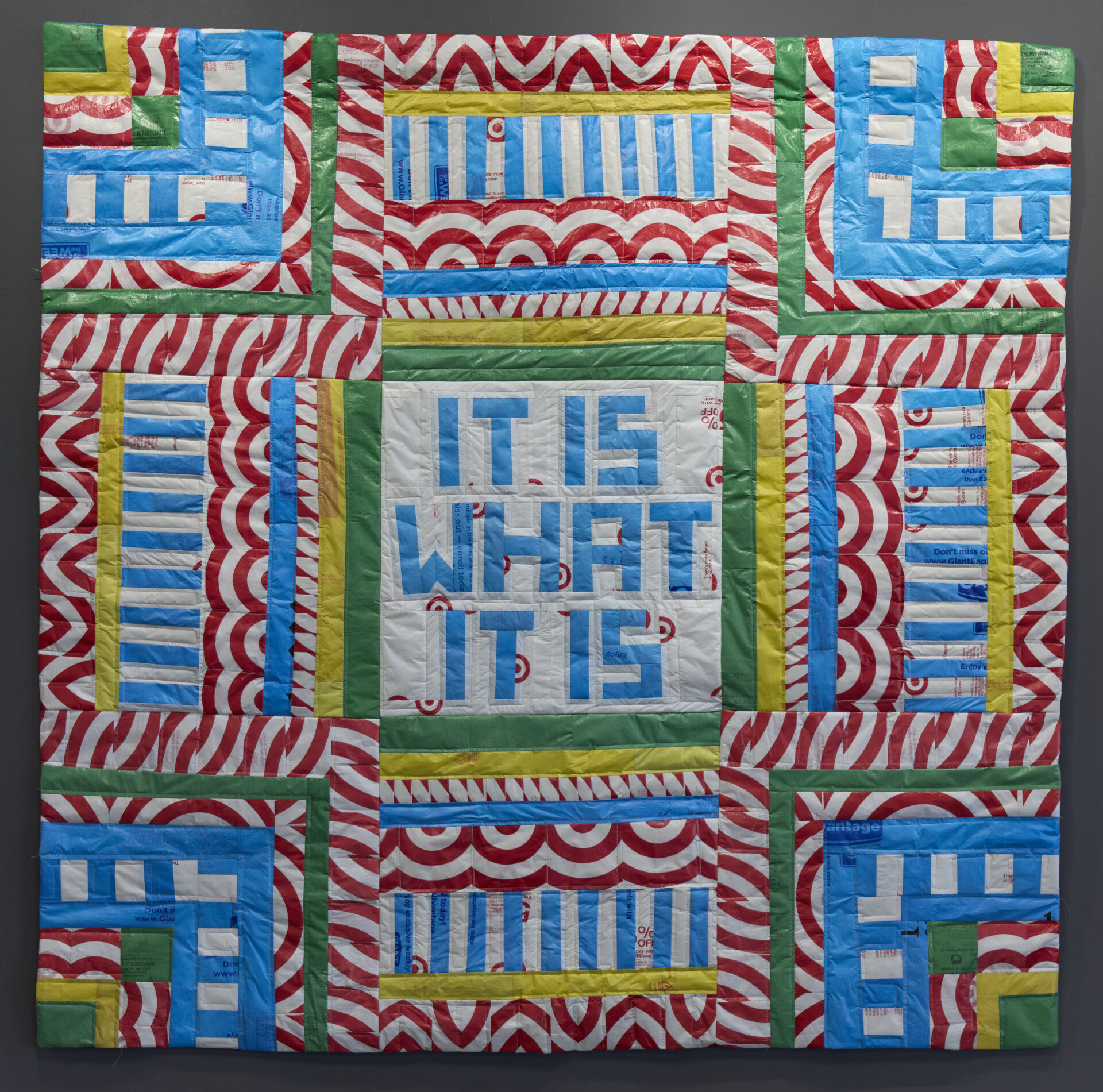 It Is What It Is by Linda McConaughy gathers four interrelated bodies of work utilizing multiple mediums including geometric abstract paintings, quilts sewn from reclaimed single-use plastic bags, and layered mixed-media pieces that explore the ways internal dialogue shapes perception, identity, and the material world. Through language, repetition, and tactile construction, the works reveal how self-understanding is formed—and often constrained—by habitual thought, cultural messages, and the aesthetics of reassurance. Across all four series, pattern serves as a visual and conceptual metaphor—repetition as reflection, form as self-examination.