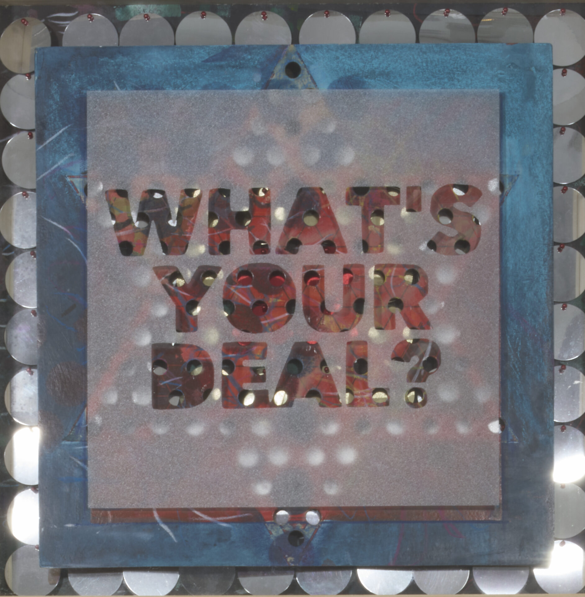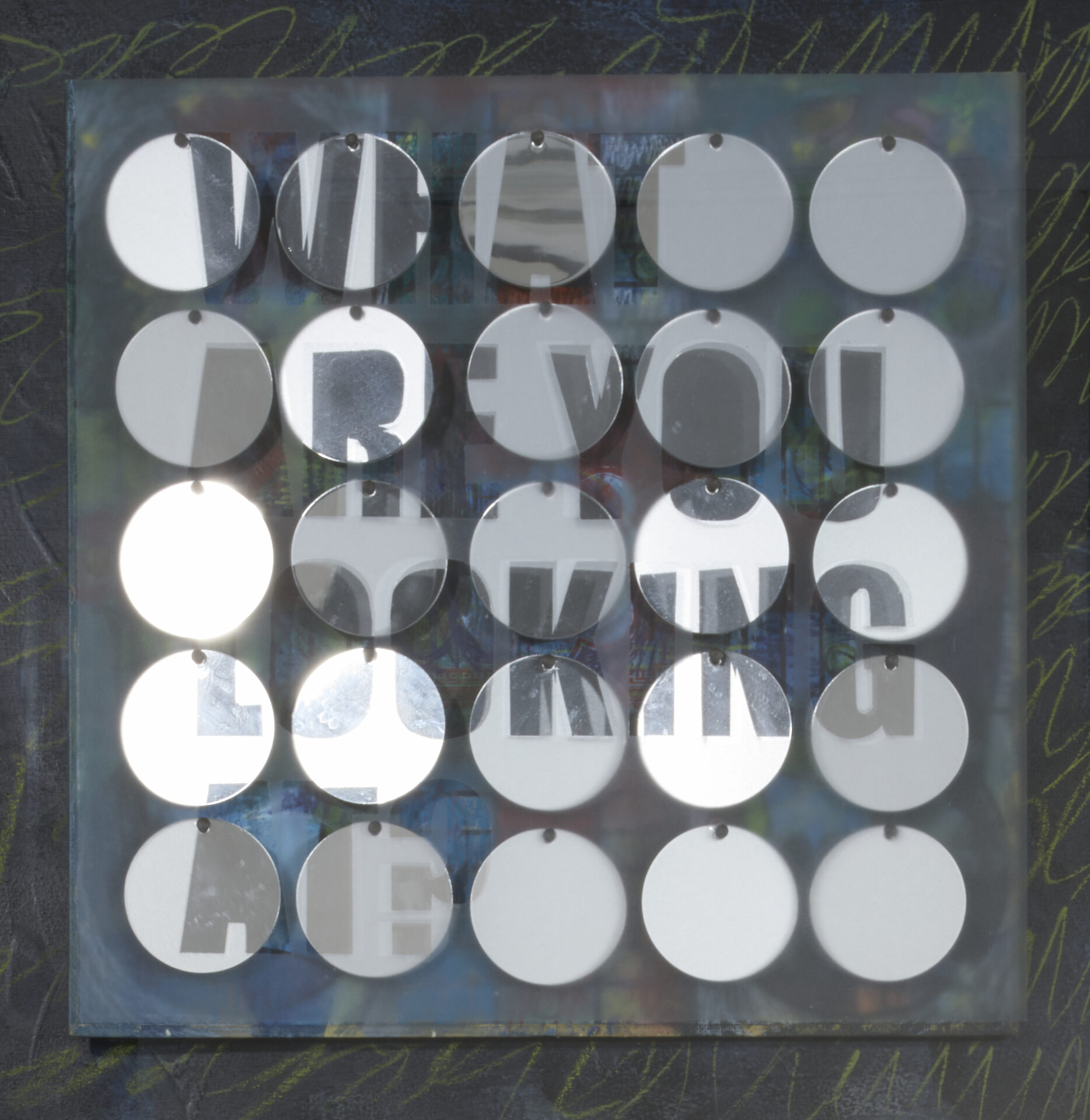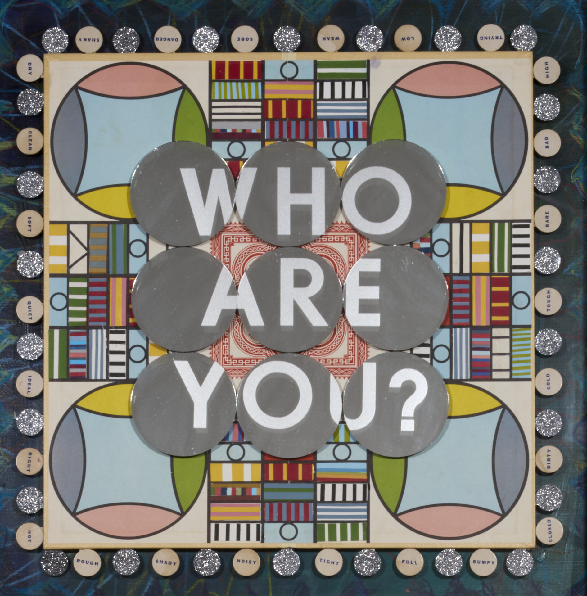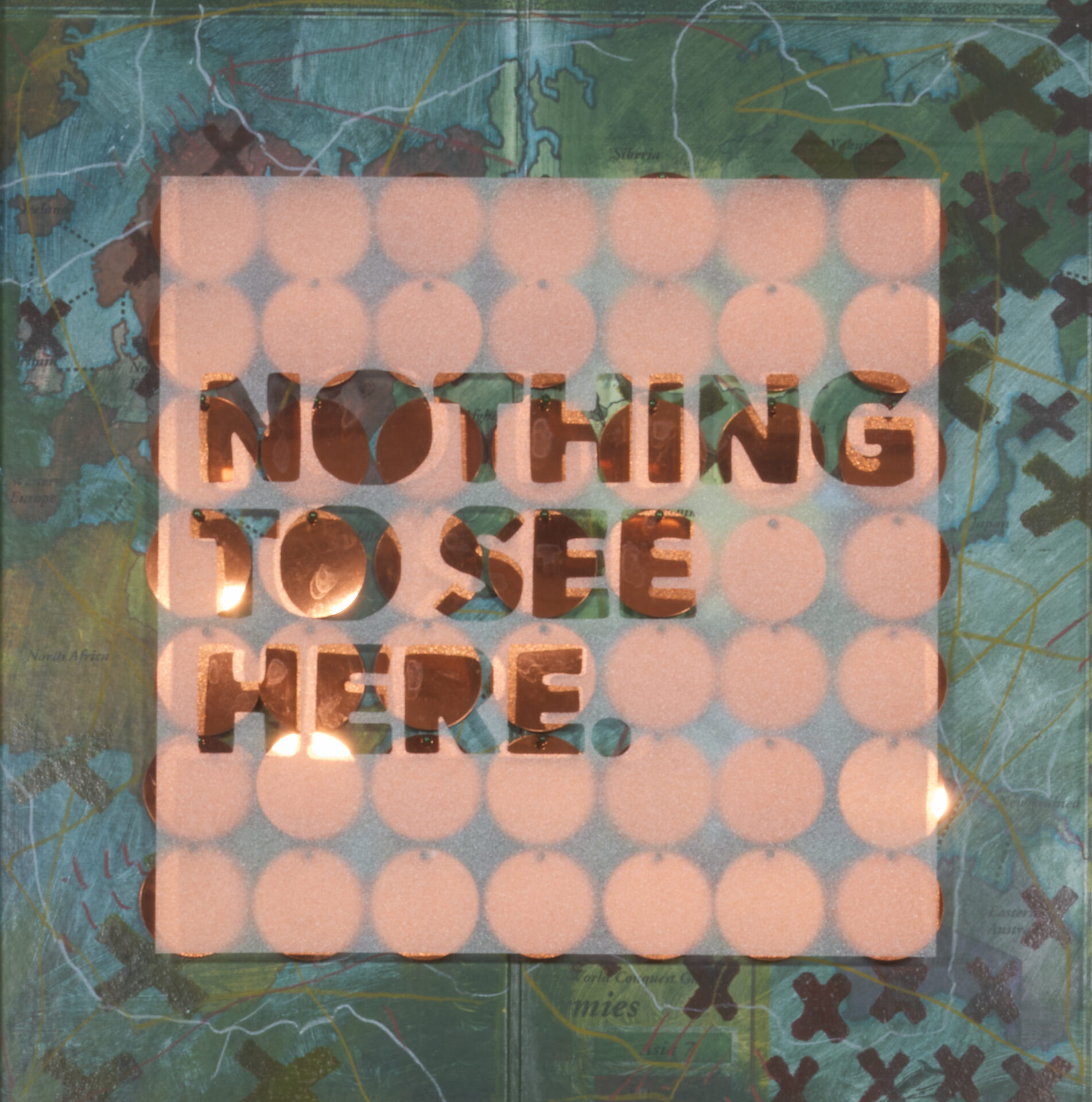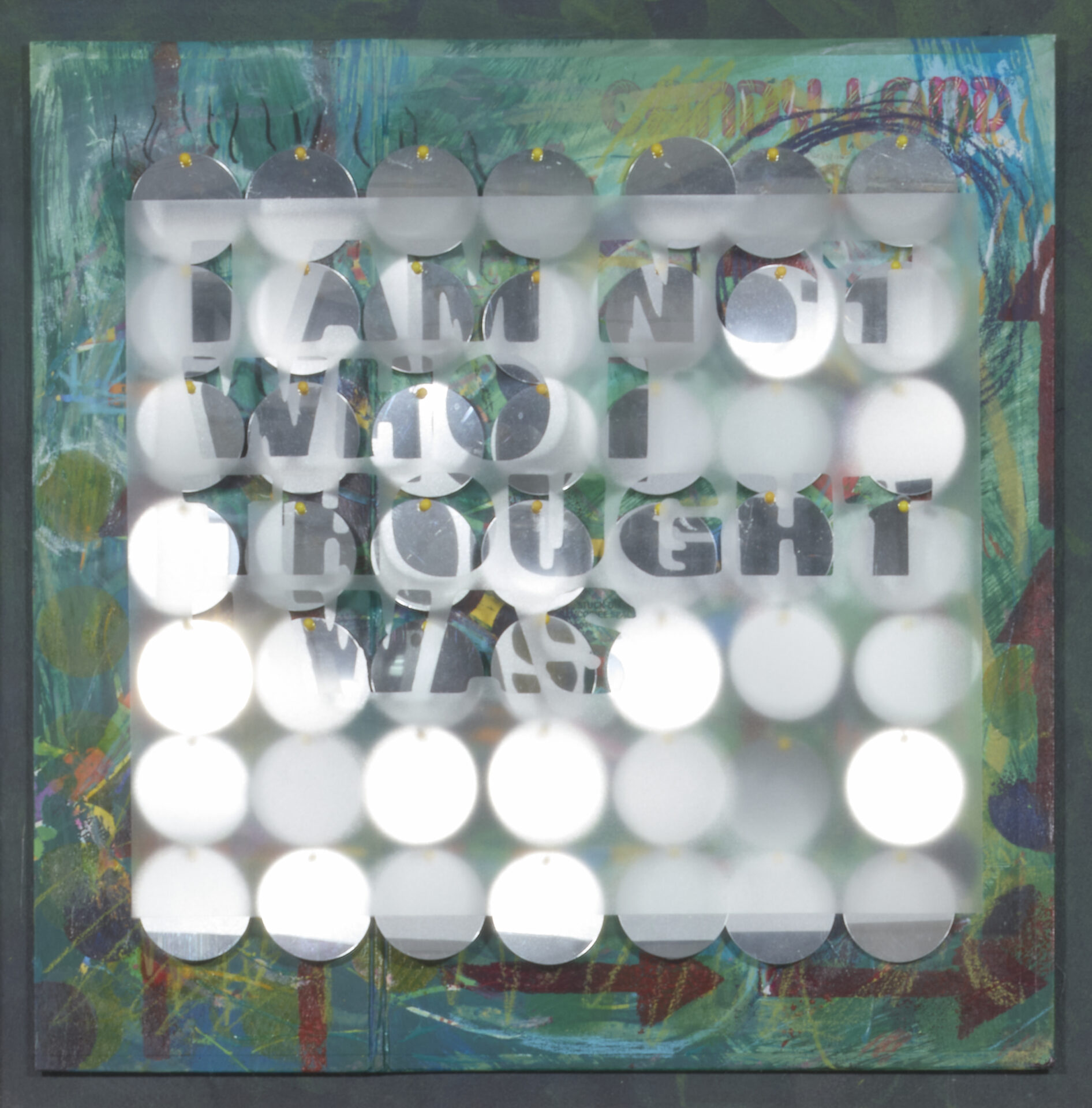 Layered mixed-media works feature phrases cut into frosted surfaces—“I AM NOT WHO I THOUGHT I WAS”, “NOTHING TO SEE HERE.” Beneath the text, game boards and mirrored forms invite viewers to look through and around language, catching glimpses of themselves as they read. These works push back against the glossy optimism of mass-produced “word art,” replacing it with honest introspection.