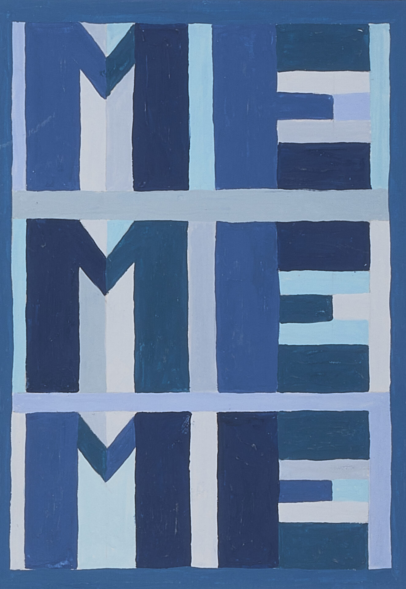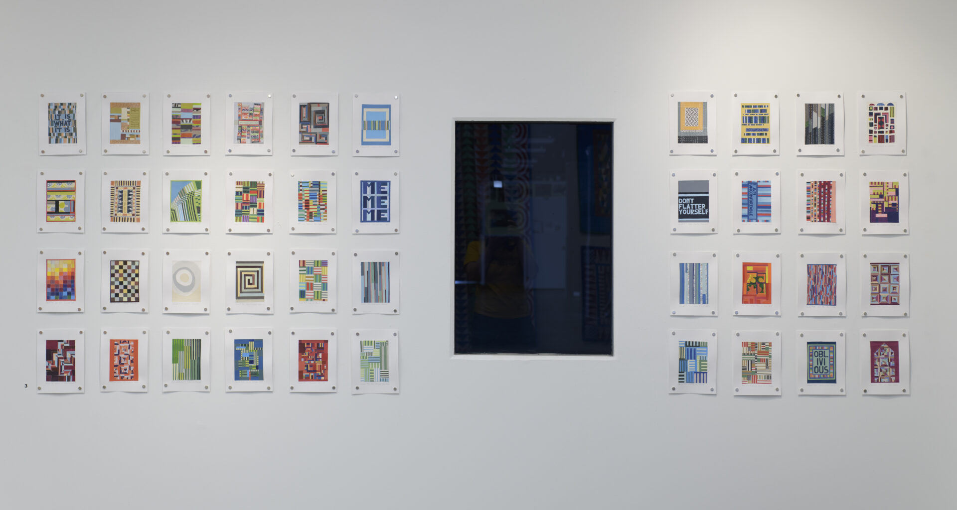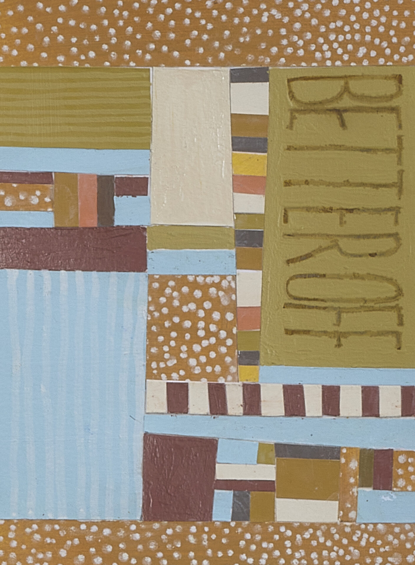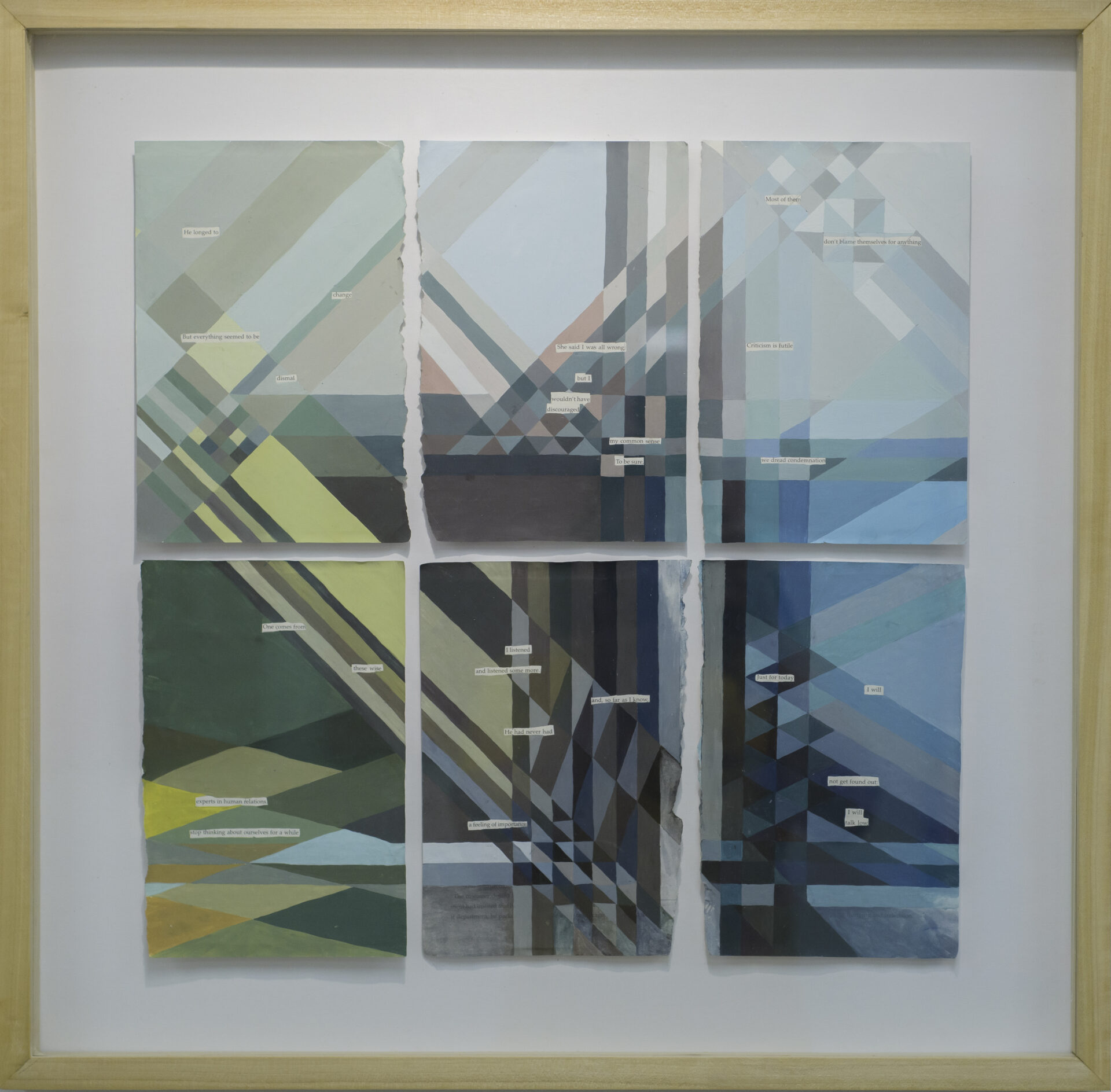 Recent paintings extend these themes through abstraction. Drawing from quilt geometry and fragments of Dale Carnegie’s How to Stop Worrying and Start Living, they transform phrases of self-help into quiet confessions.