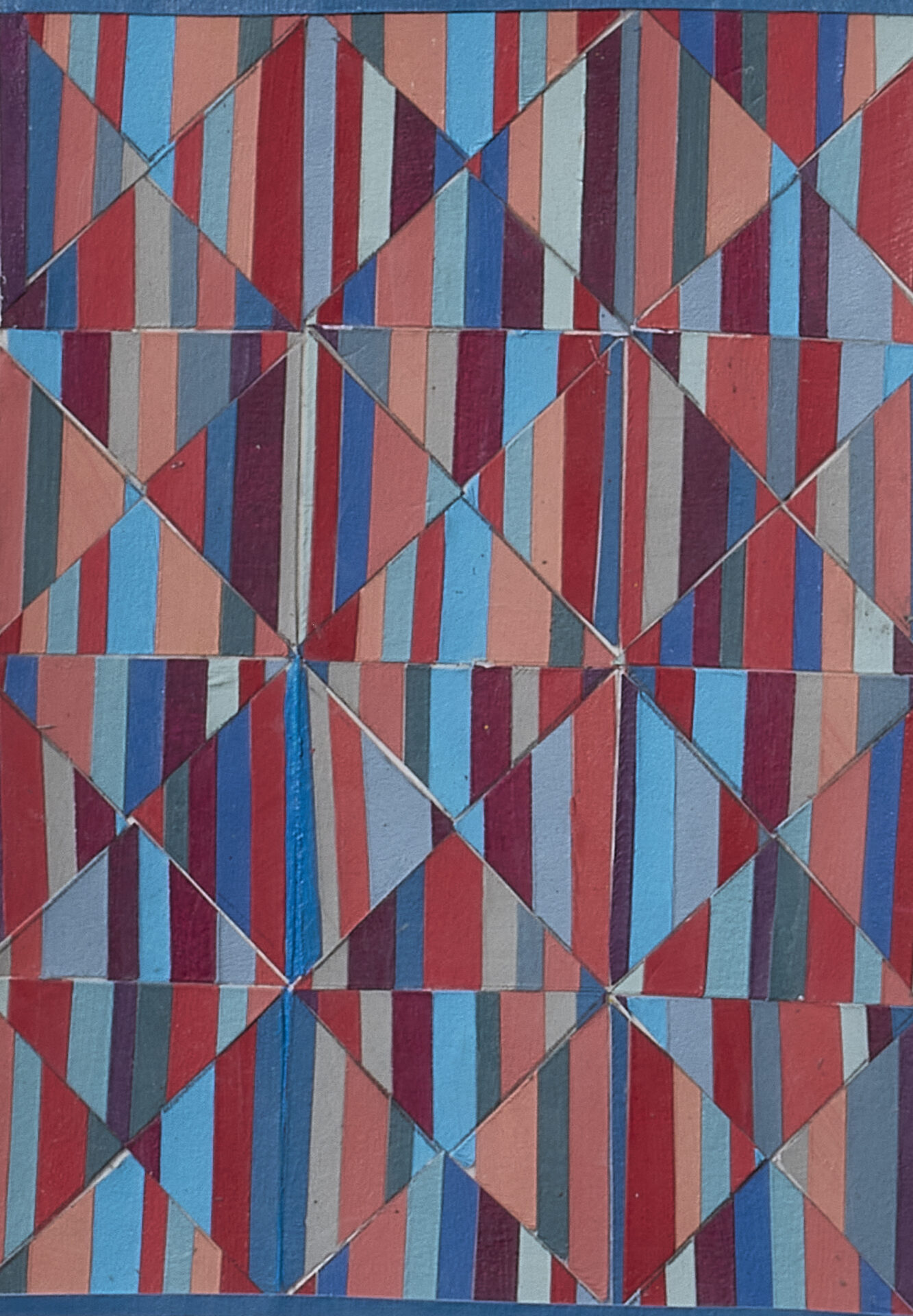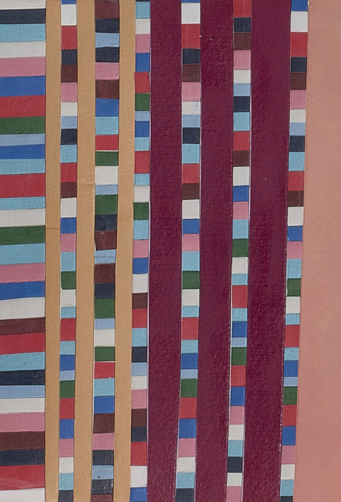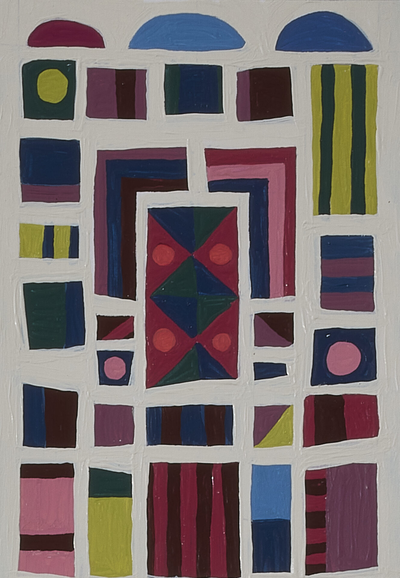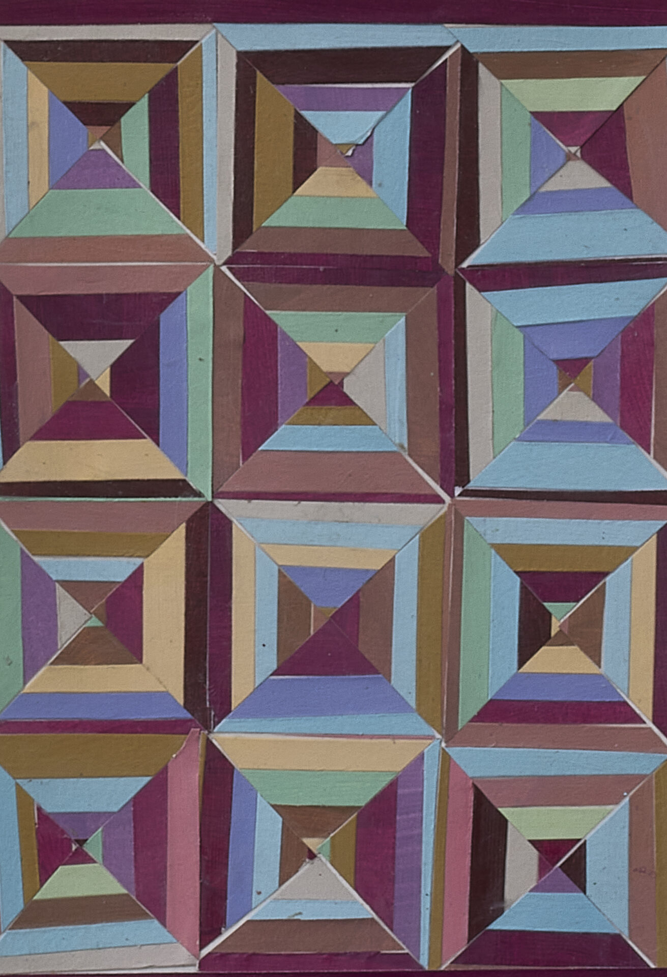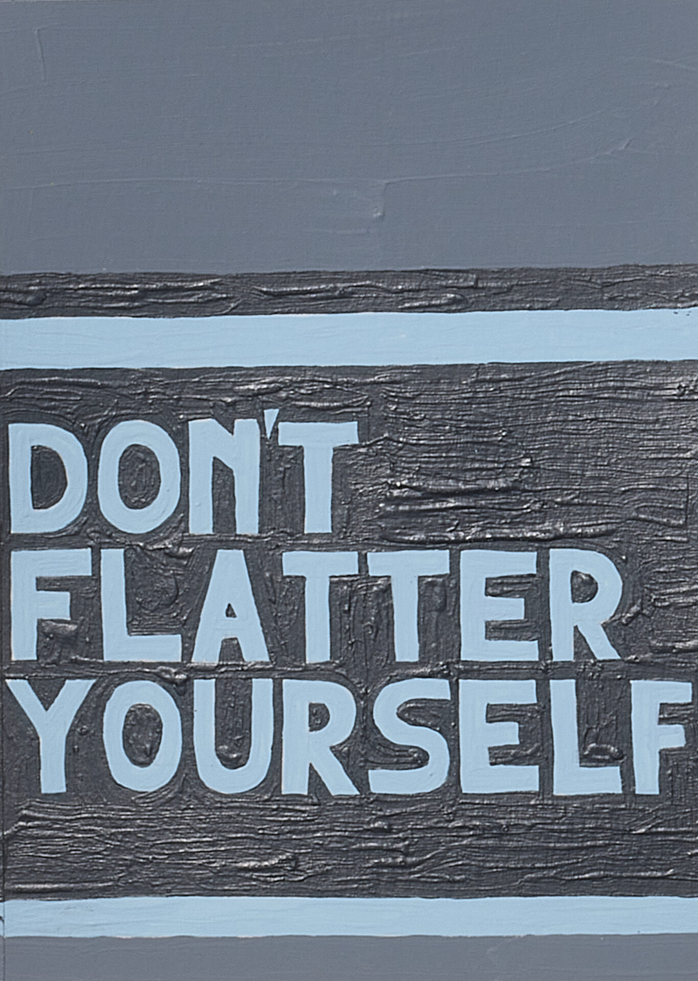 Recent paintings extend these themes through abstraction. Drawing from quilt geometry and fragments of Dale Carnegie’s How to Stop Worrying and Start Living, they transform phrases of self-help into quiet confessions.
