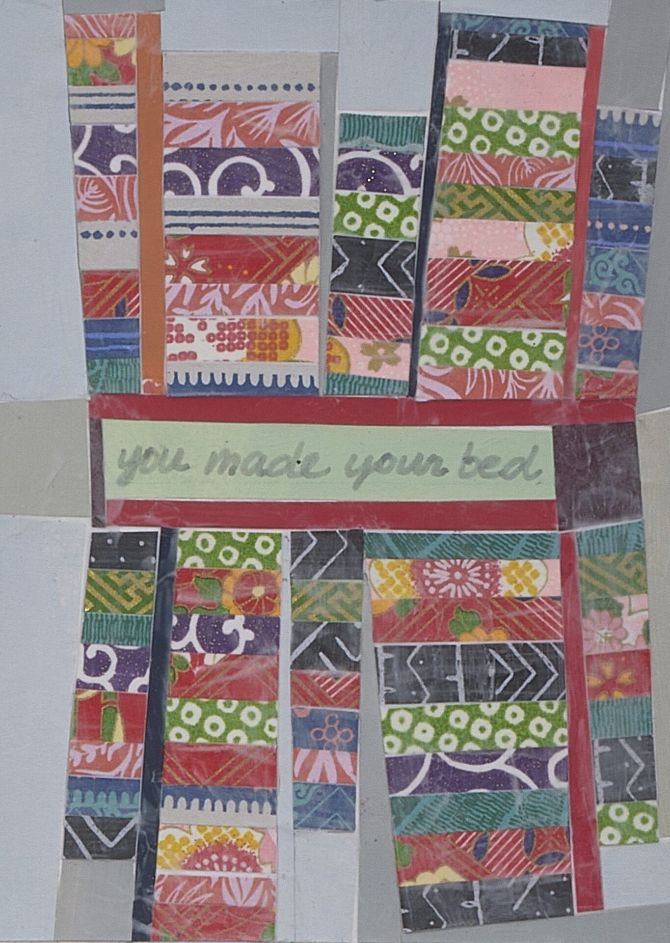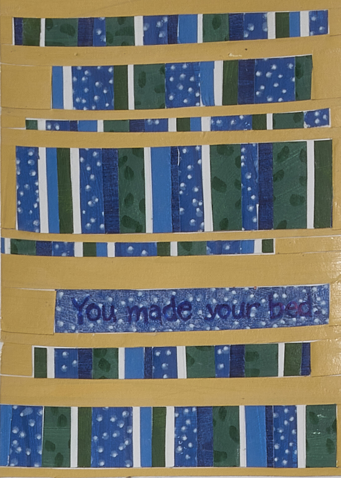 Quilts hand-sewn from reclaimed plastic bags transform disposable materials into enduring, time-intensive craft, asking what is valued or discarded in women’s work. The installation You Made Your Bed continues this reflection: forty quilts, stacked high on a simple bed, evoke both comfort and accumulation. Because only the quilt edges are visible, a series of small 4″ x 5″ collage images accompanies the installation—an intimate index revealing what lies beneath the surface.